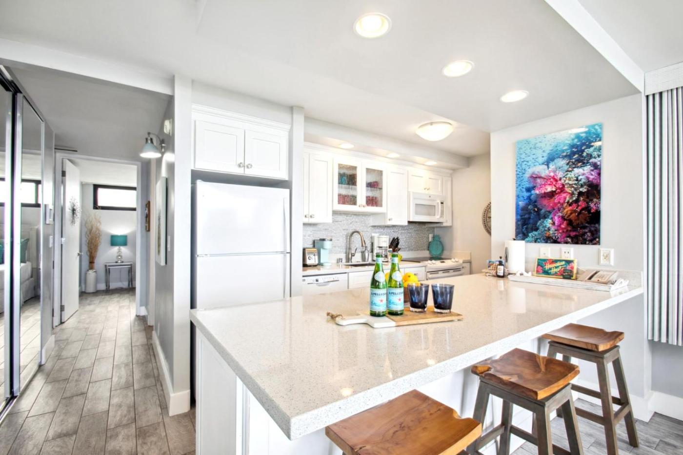 KBM Resorts Spacious 6-Bedroom Papakea Resort Collection Multi Unit Listing Same Floor Ocean Views 2 Free Rental Cars PKC-40304. The fully equipped kitchen features a refrigerator, a dishwasher, kitchenware and an oven. The spacious apartment provides air conditioning, a tea and coffee maker, a balcony with sea views as well as a private bathroom featuring a shower. ;