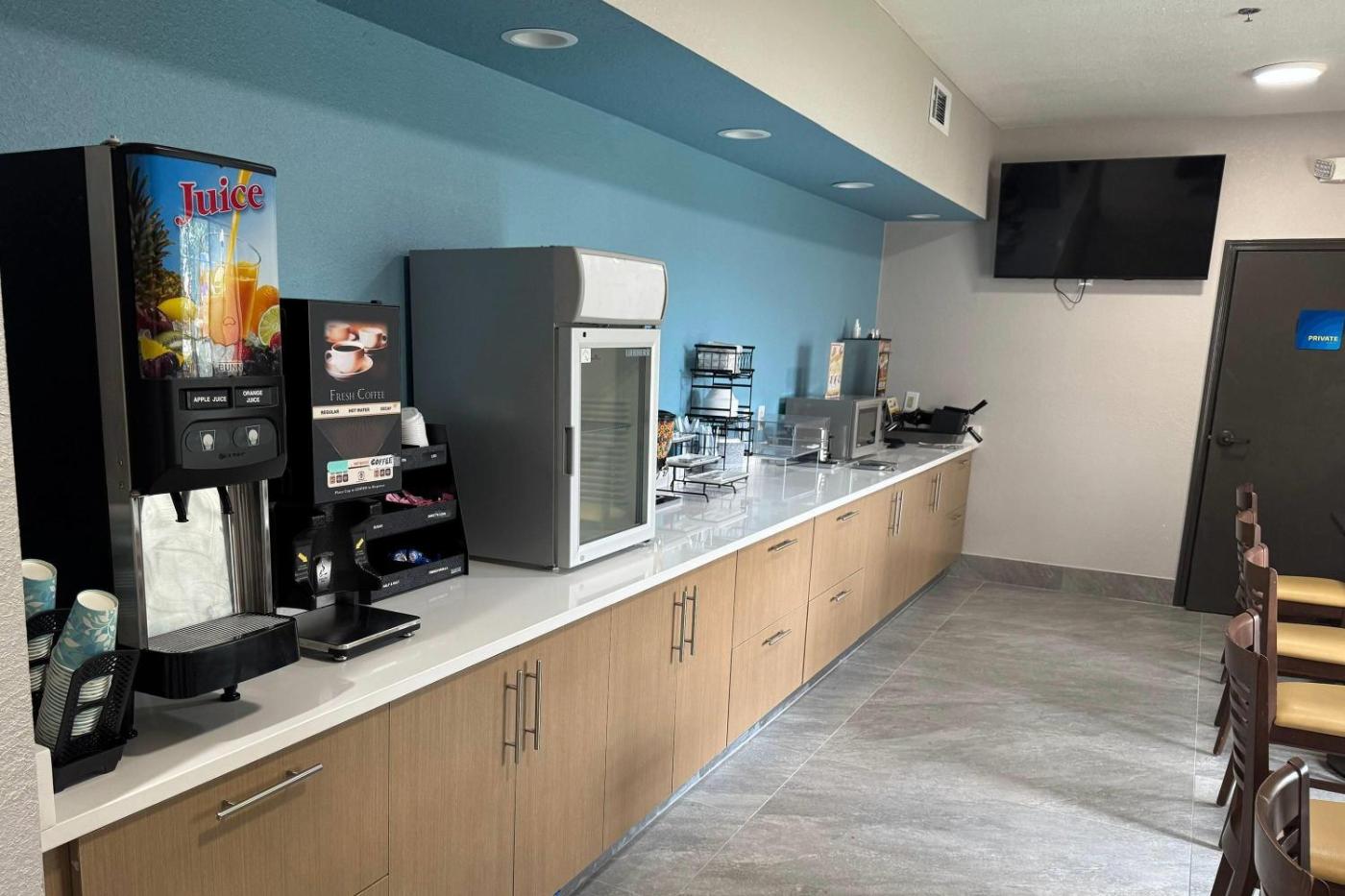 A small gym is offered at the hotel. The hotel also includes a business center with fax and photocopying services. A breakfast buffet with 40 food items is offered. Popcorn and cookies available during the social hour every night.