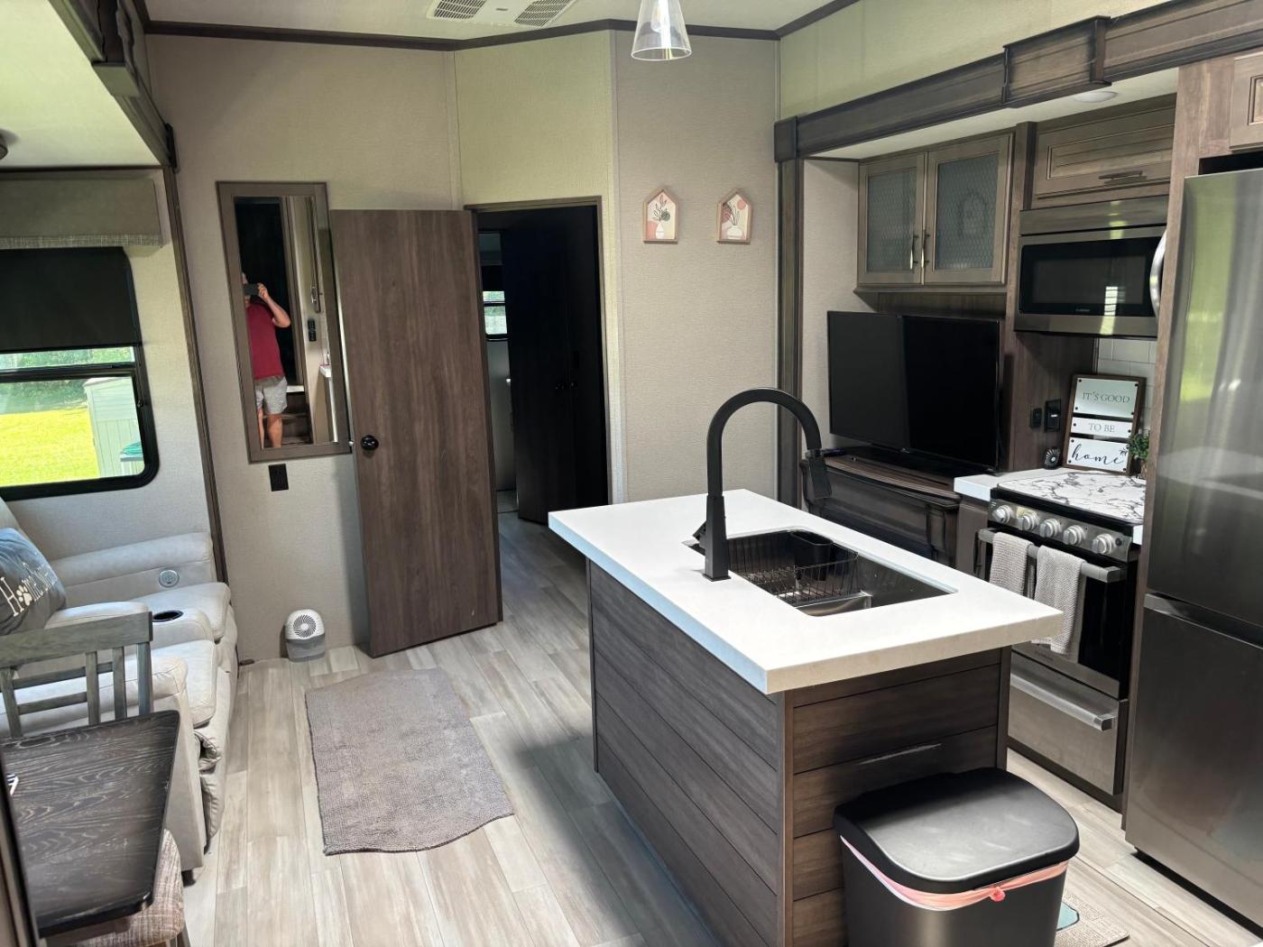 Mobile Home. The fireplace is a top feature of this mobile home. Boasting a private entrance, this air-conditioned mobile home comes with 1 bedroom and 2 bathrooms with a walk-in shower and a hairdryer. This mobile home has a tea and coffee maker, a seating area, a flat-screen TV with streaming services and an outdoor dining area. The unit has 5 beds.