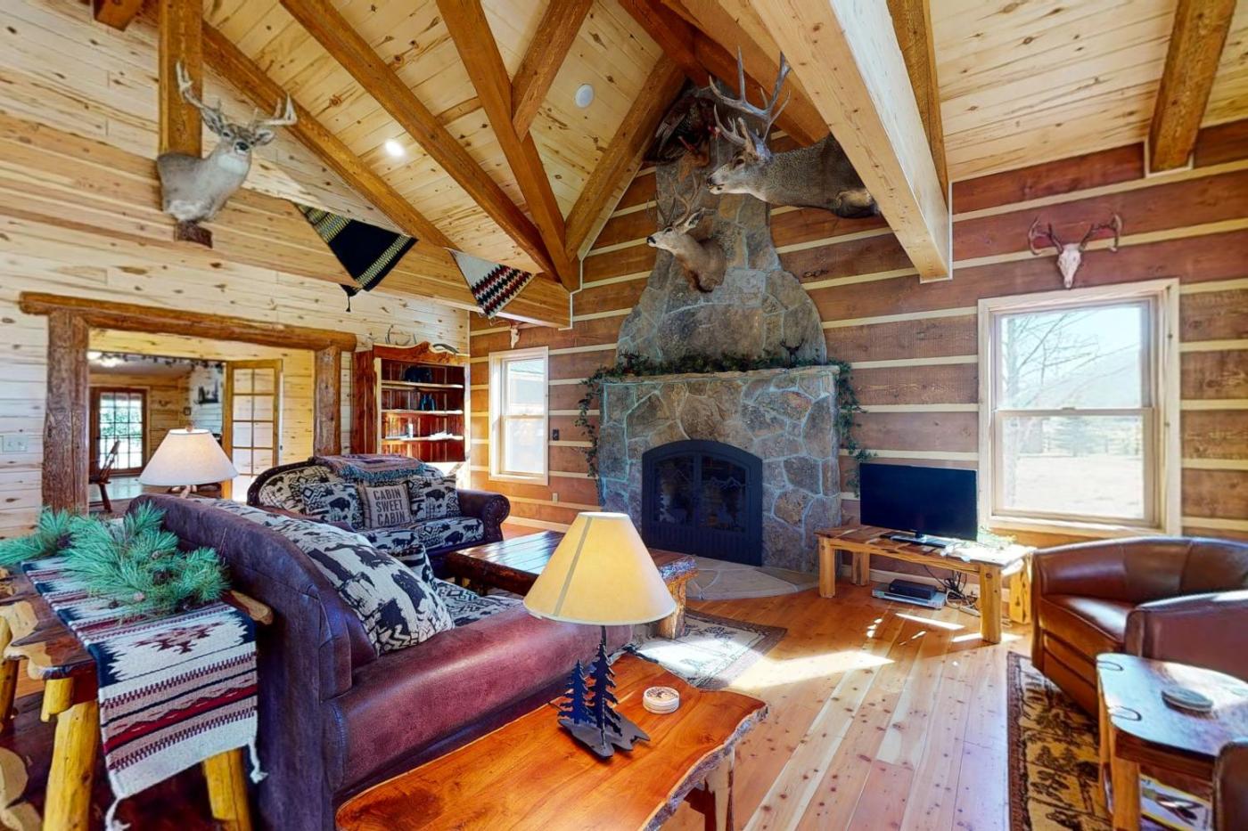 The spacious holiday home has 5 bedrooms, 3 bathrooms, a flat-screen TV with satellite channels, a dining area, a fully equipped kitchen, and a patio with mountain views. There is also a seating area and a fireplace.