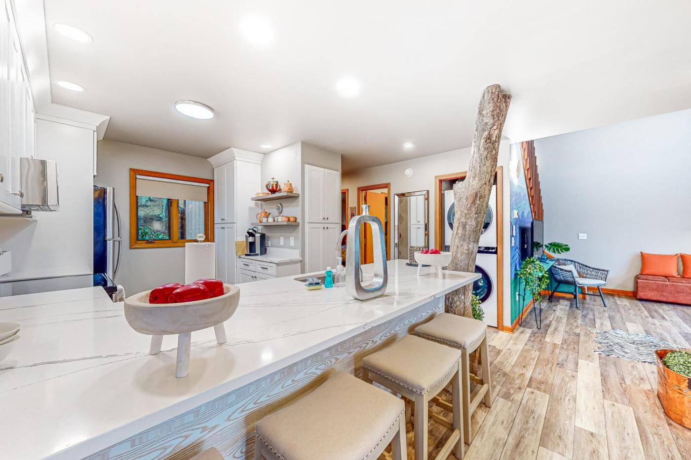 One-Bedroom Apartment. Featuring a private entrance, this air-conditioned apartment is comprised of 1 living room, 1 separate bedroom and 2 bathrooms with a walk-in shower and a bath. The well-equipped kitchen features a stovetop, a refrigerator, a dishwasher and an oven. The spacious apartment offers a washing machine, a tea and coffee maker, a seating area, a TV with streaming services, as well as mountain views. The unit offers 3 beds.