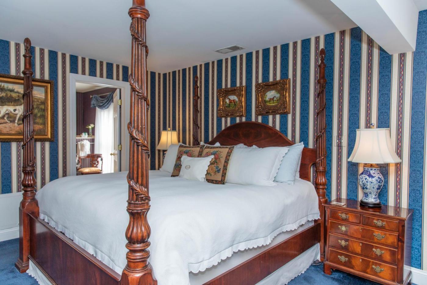 King Room. The Meade Room is located in the Mansion on the second floor. It features a king bed, steam shower and wood-burning fireplace. ;